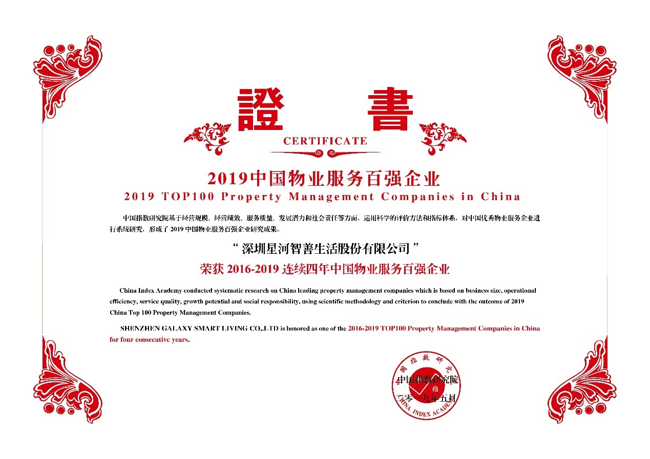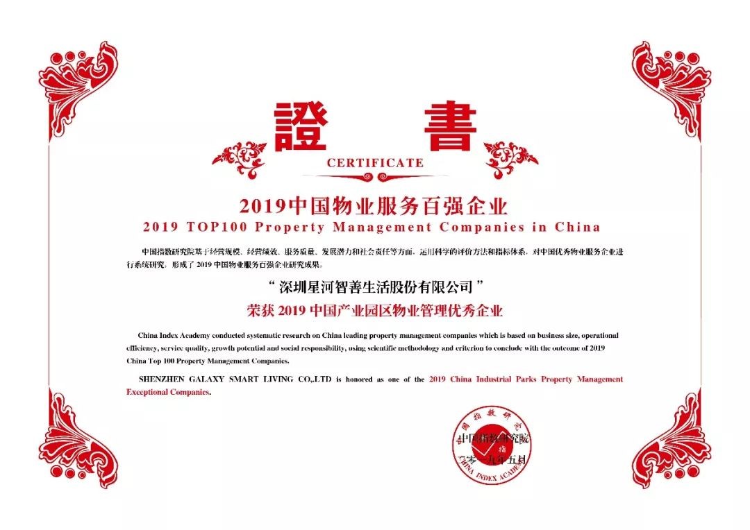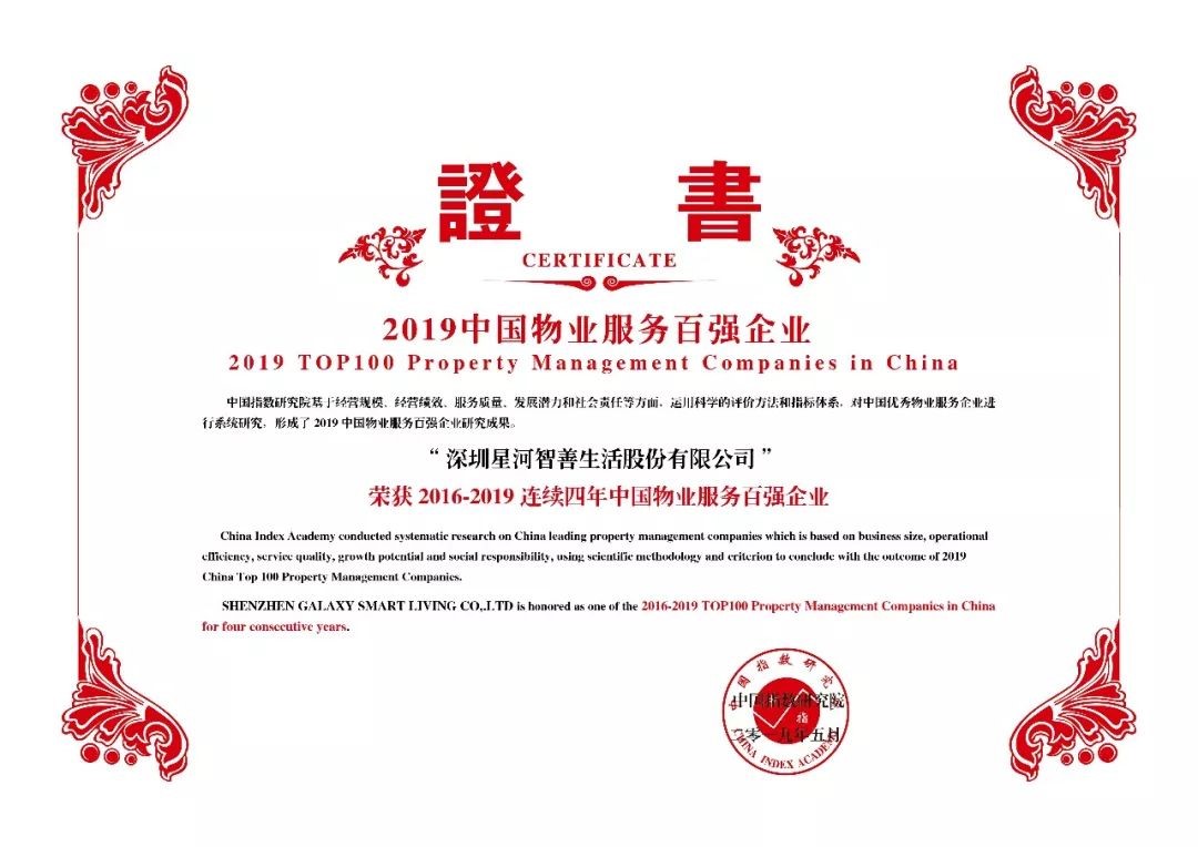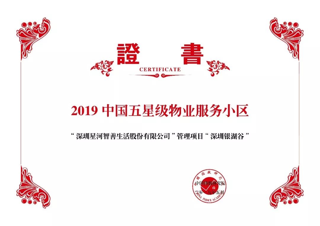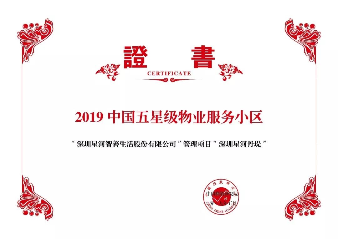星河世俱杯(中国)生活凭借业内领先的综合实力和服务水平,荣居百强企业第57位,荣膺“2016-2019连续四年中国物业服务百强企业”、“2019中国产业园区物业管理领先企业”、“2019中国商业物业管理领先企业”,在管项目深圳星河丹堤和深圳银湖谷均荣获“2019中国五星级物业服务小区”,共斩获五项殊荣。