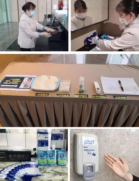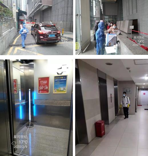 星河智善生活全面加强在管写字楼各区域的消毒、消杀:对大堂、前台、广场、外围垃圾桶等公共部位每2小时消毒1次;对电梯按钮、电梯轿厢门、洗手间马桶、蹲位、小便器各接触点、洗手台、洗手液、纸巾盒、镜面等频繁接触点每2小时消毒1次;对停车场公区垃圾桶、垃圾中转站等公共部位每天不少于1次无死角全面消毒、消杀。此外星河智善生活在大堂礼宾台、候梯厅等密集处均提供免洗消毒液、一次性按键用纸等供客户取用。