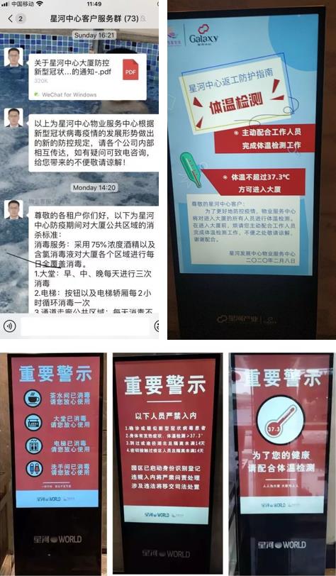 星河智善生活全体员工实行每天健康动态报备及上下班体温检测,每个写字楼项目每日、每班次对物业员工进行体温监测,记录相关数据,掌握非在岗员工的外出动向,提醒员工注意个人安全。对已进入湖北区域的休假员工进行健康情况监控,达到隔离标准且身体健康方可返岗上班。