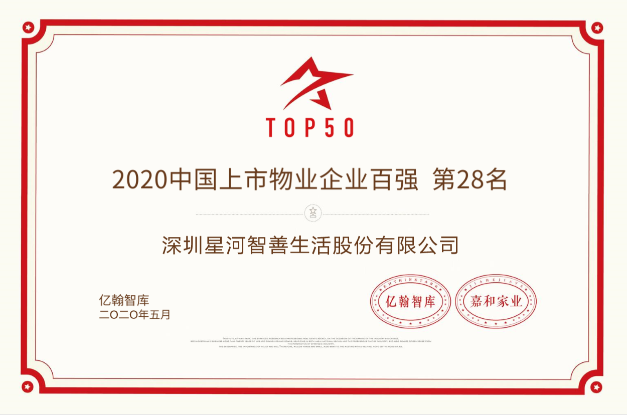 2020年5月28日,由亿翰智库、嘉和家业物业服务研究院、天武云算主办的“中国上市物业企业百强”研究成果正式发布。星河智善生活凭借强劲的综合实力和良好的发展潜力,荣获“2020中国上市物业企业TOP30”,位列第28名。