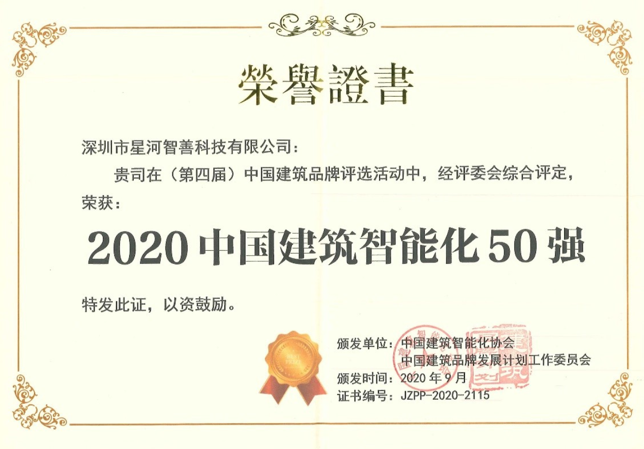2020年9月29日,由中国建筑智能化协会主办的第四届“中国建设行业品牌发展峰会”研究成果正式公布,星河智善科技公司凭借高质量的智能化建筑解决方案、优质的服务质量和良好的发展潜力荣获“中国建筑智能化50强”。