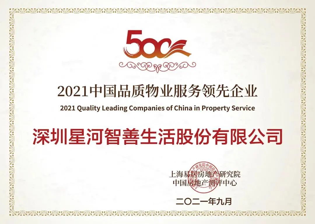 此次荣获“2021中国品质物业服务领先企业”等奖项主要得益于星河精品服务和成熟标准体系。秉承着”星服务·心托付“的服务理念,以ISO质量体系、环境体系、能源体系、信息安全体系、职业健康安全体系五大管理体系为基础,特色“星产品”品质保障为核心,建立起高品质、全周期的物业服务体系,致力于打造极致客户体验,赢得业主、客户及业内同行、合作伙伴的信任和赞誉,先后获得“连续六年中国物业服务百强企业”、“中国物业服务专业化运营领先品牌企业”、”卓越智慧科技创新企业“等荣誉。
